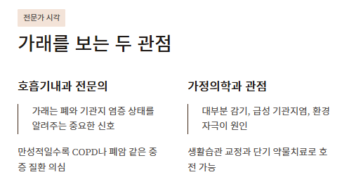 호흡기내과 전문의 입장에서는 가래가 폐와 기관지 염증 상태를 알려주는 중요한 신호로, 만성적일수록 COPD나 폐암 같은 중증 질환을 의심해야 하는 가래가 생기는 원인으로 본다. 반대로 일차의료나 가정의학과 관점에서는 대부분의 가래가 감기, 급성 기관지염, 환경 자극처럼 비교적 가벼운 가래가 생기는 원인에서 시작해 생활습관 교정과 단기 약물치료만으로도 호전되는 경우가 많다고 설명한다.