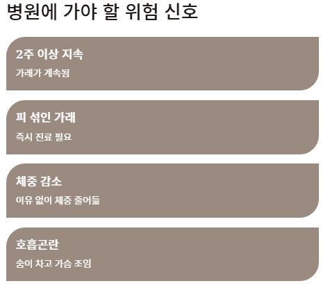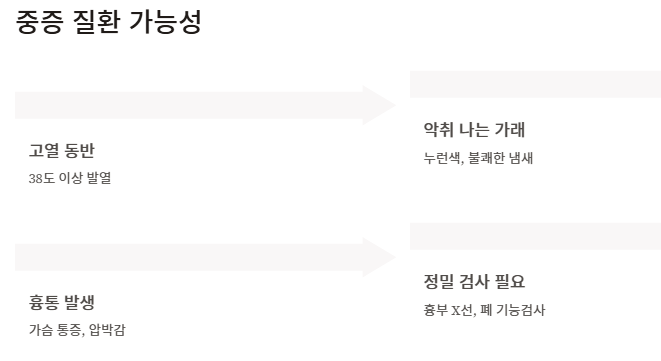 2주 이상 지속되는 가래, 피 섞인 가래, 체중 감소, 숨이 차고 가슴이 조이는 증상은 단순한 가래가 생기는 원인 이상을 시사하므로 반드시 진료가 필요하다. 고열, 누런 또는 악취 나는 가래, 흉통이 동반될 경우 폐렴, 농양, 폐암 등 중증 질환이 가래가 생기는 원인일 수 있어 흉부 X선, 폐 기능검사 등 정밀 검사가 권장된다.