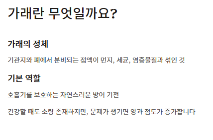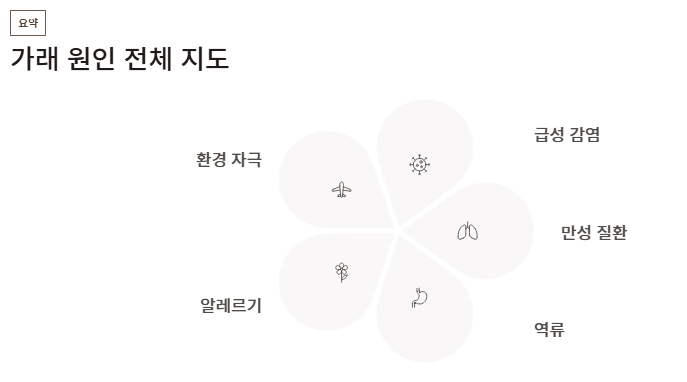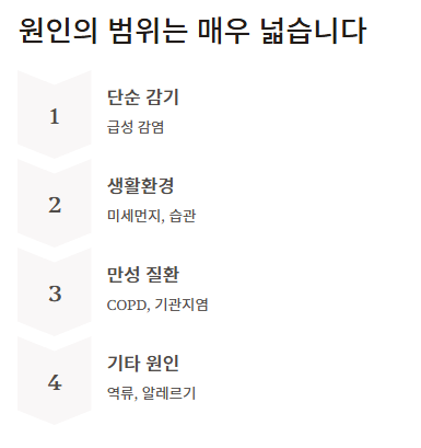 이처럼 가래가 생기는 원인은 호흡기 외에도 소화기, 알레르기 질환과 연결될 수 있어 증상 패턴을 잘 관찰하는 것이 중요하다.