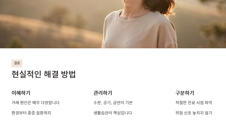 가래가 생기는 원인은 환경 자극, 급성 감염부터 만성 기관지염, COPD, 역류성 식도염, 알레르기까지 매우 다양하다. 수분과 공기 관리, 금연, 생활습관 교정은 대부분의 가래가 생기는 원인을 완화하는 기본 전략이며, 증상이 오래 가거나 악화되거나 다른 전신 증상이 동반될 경우에는 전문 진료를 통해 정확한 가래가 생기는 원인을 확인해야 한다.