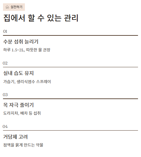 이 경우 가래가 생기는 원인을 줄이려면 금연, 공기청정기 사용, 마스크 착용, 하루 1.5~2L 수분 섭취가 기본 전략이다.