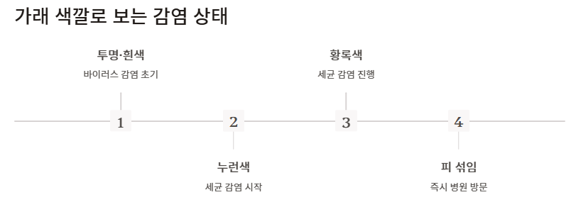 세균 감염일수록 가래의 색이 진해지고 양이 늘어나며, 흉부 불편감과 호흡곤란이 동반되면 폐렴 등으로 진행되었을 가능성이 있다.