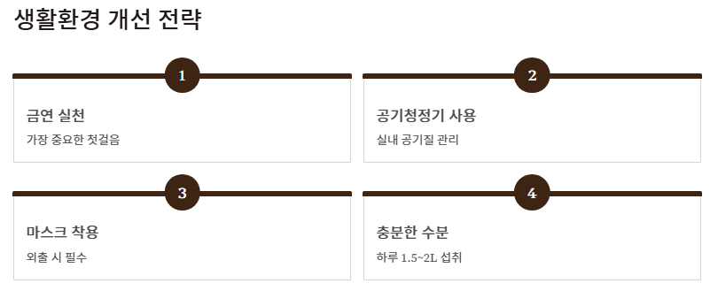 이런 생활요법은 감염이나 만성 질환 여부와 상관없이 공통적으로 적용 가능한 가래가 생기는 원인 완화 전략이다.