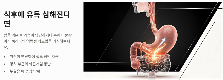 - 소화기계 질환: 식후에 특히 가슴이 답답한 증세가 나타나고 목에 이물감이 느껴진다면 역류성 식도염일 확률이 높습니다. 위산이 역류하며 식도를 자극해 가슴이 답답한 증세를 유발하는 것입니다.