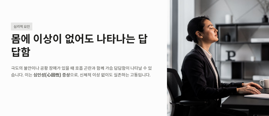 - 심리적 요인: 극도의 불안이나 공황 장애가 있을 때 호흡 곤란과 함께 가슴이 답답한 증세가 나타날 수 있습니다. 이는 신체적 이상이 없어도 나타나는 심인성 가슴이 답답한 증세입니다.