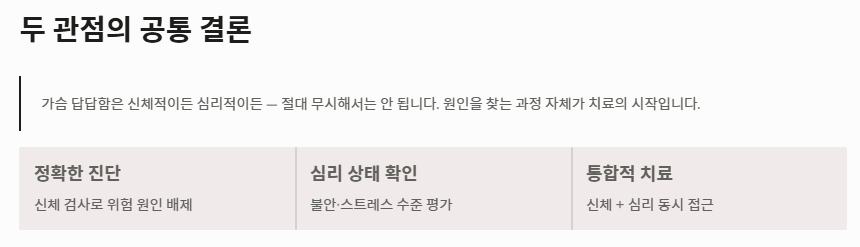 - 관점 B: 심신 통합적 접근 최근 현대인들에게 나타나는 가슴이 답답한 증세는 스트레스와 자율신경계 불균형에서 오는 경우가 많다는 점에 주목합니다. 검사상 정상이라도 환자가 느끼는 가슴이 답답한 증세는 실존하므로 심리 치료를 병행해야 한다는 시각입니다.