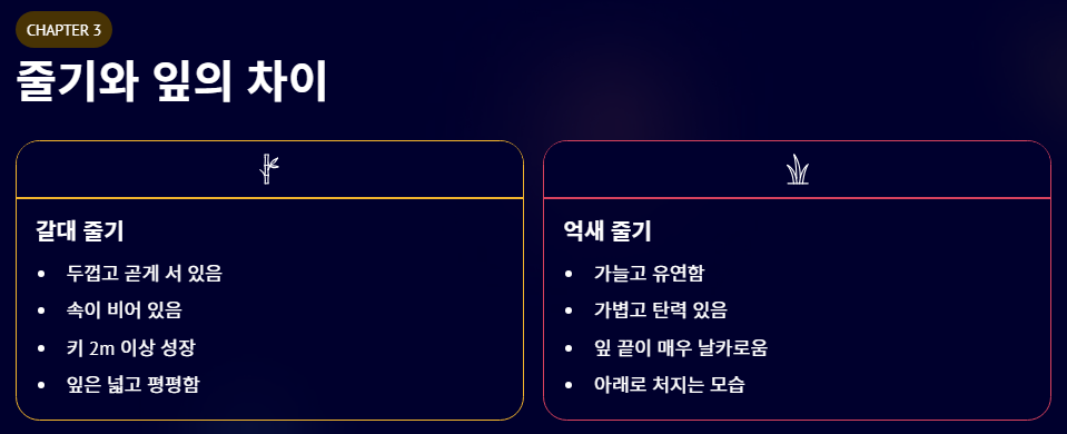 - 억새: 줄기는 갈대보다 가늘고 유연하며, 전체적으로 가볍고 탄력 있는 느낌입니다. 잎 끝이 매우 날카로워 스치면 베이기 쉽고, 길게 뻗으면서도 아래로 처지는 모습이 특징입니다.