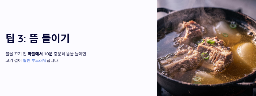 - 뜸 들이기: 불을 끄기 전 10분 정도 약불에서 충분히 뜸을 들이면 고기의 결이 더 부드러워집니다.