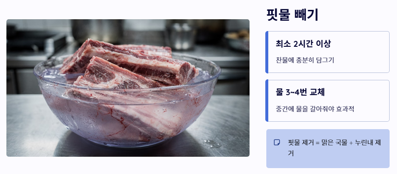 - 핏물 빼기의 중요성: 갈비탕 맛있게 끓이는 법에서 가장 먼저 해야 할 일은 찬물에 갈비를 담가 핏물을 충분히 빼는 것입니다. 최소 2시간 이상, 중간에 물을 3~4번 갈아주며 핏물을 빼야 국물이 탁해지지 않고 누린내가 나지 않습니다.