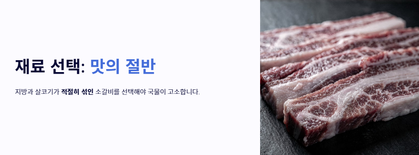 맛있는 요리는 좋은 재료에서 시작됩니다. 특히 소갈비는 지방과 살코기가 적절히 섞인 것을 골라야 국물 맛이 고소합니다.