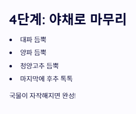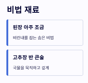 - 쌀뜨물 전처리와 된장/생강을 활용한 양념장으로 잡내를 잡고 감칠맛을 올립니다.