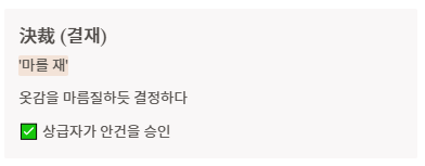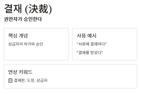 | 결재(裁) | 승인, 허가, 결정 | 결재판, 도장, 상급자 | "휴가 신청서를 결재받았다." |