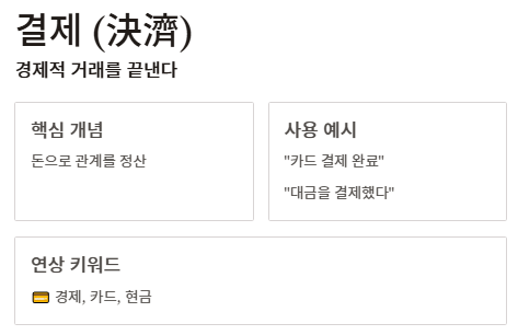 | 결제(濟) | 경제적 지불, 청산 | 경제, 카드, 현금 | "밀린 대금을 결제했다." |
