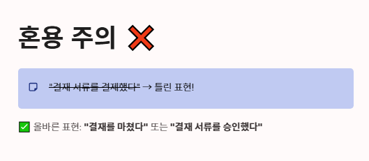 - 혼용 주의: "결재 서류를 결제했다"는 말은 틀립니다. "결재 서류를 승인했다" 혹은 "결재를 마쳤다"가 올바른 표현입니다.