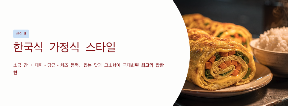 - 관점 B: 한국식 '가정식' 스타일 (고소함과 든든함) 소금 간을 기본으로 하며 대파, 당근, 치즈 등을 듬뿍 넣어 씹는 맛과 고소함을 극대화합니다. 투박하지만 밥반찬으로 최고의 궁합을 자랑하며, 누구나 쉽게 따라 할 수 있는 실용적인 계란말이 맛있게 하는법입니다.