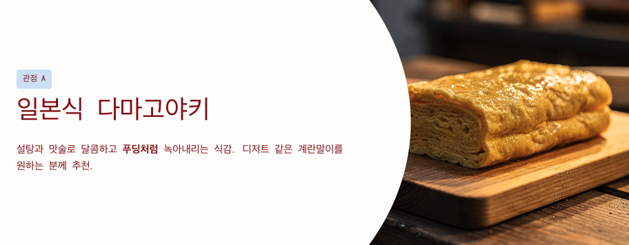 - 관점 A: 일본식 '다마고야키' 스타일 (단맛과 부드러움) 설탕과 맛술을 넉넉히 넣어 달콤하고 푸딩처럼 녹아내리는 식감을 강조합니다. 사각 팬을 사용해 아주 얇은 층을 수십 번 겹쳐 만드는 정성을 요하며, 디저트 같은 계란말이 맛있게 하는법을 선호하는 분들에게 적합합니다.