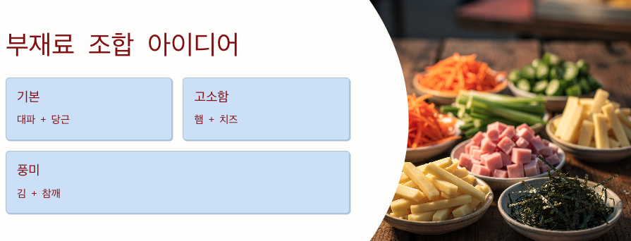 - 부재료는 잘게 썰기: 당근, 대파, 햄 등을 넣을 때는 아주 잘게 다져야 합니다. 입자가 크면 말 때 달걀피가 찢어지기 쉽기 때문입니다.