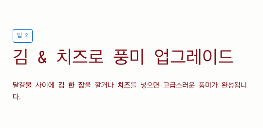 - 김이나 치즈 활용: 달걀물 사이에 김 한 장을 깔거나 치즈를 넣으면 맛의 풍미가 배가되는 고급스러운 계란말이 맛있게 하는법이 됩니다.