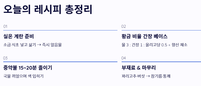 - 남은 국물 활용: 계란을 다 먹고 남은 간장 국물은 버리지 마세요. 볶음밥이나 어묵볶음의 양념으로 재활용하면 깊은 맛을 낼 수 있는 훌륭한 만능 간장이 됩니다.