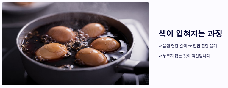 이제 계란에 갈색빛 옷을 입히고 감칠맛을 더할 조리 단계입니다.