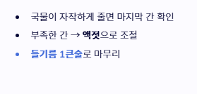 - 처음엔 뚜껑을 열고 끓여 비린내를 날리고, 중약불에서 은근히 조려 간을 배게 합니다.