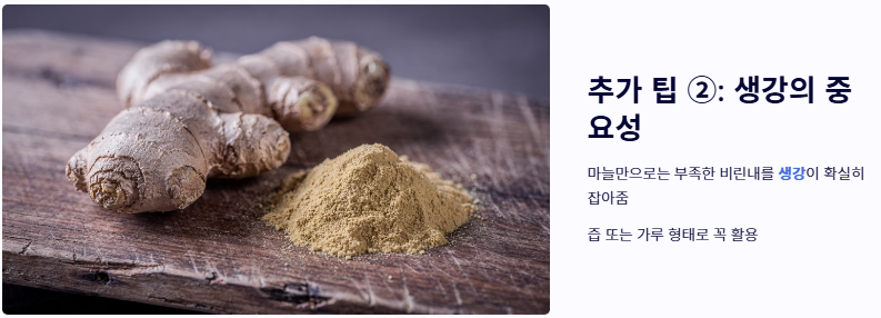 - 생강의 중요성: 마늘만으로는 부족한 생선 비린내를 생강이 확실히 잡아줍니다. 즙이나 가루를 꼭 활용해 보세요.