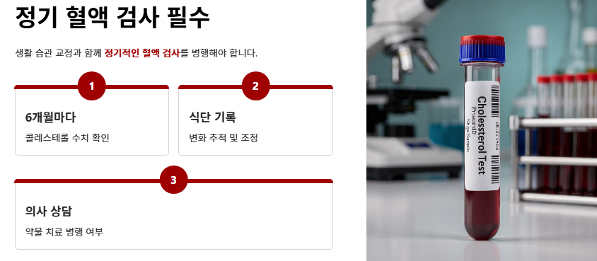 - 생활 습관 교정과 함께 정기적인 혈액 검사를 병행해야 합니다.