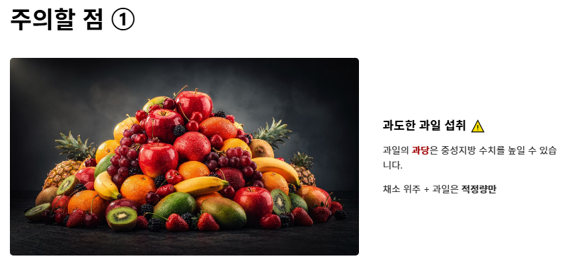 - 과도한 과일 섭취: 과일의 과당은 오히려 중성지방 수치를 높일 수 있습니다. 채소 위주로 섭취하되 과일은 적정량만 드세요.