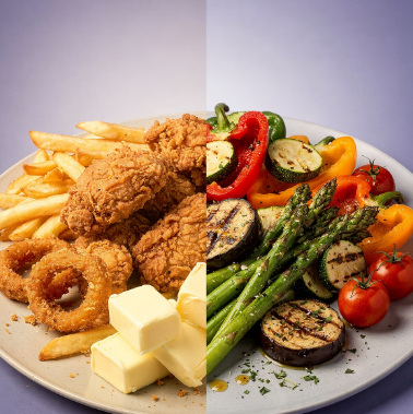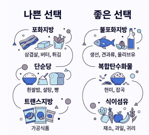 포화지방과 트랜스지방은 혈관의 최대 적입니다. 삼겹살, 버터, 튀김류를 줄이고 그 자리를 고지혈증에 좋은 음식들로 채우는 것이 첫걸음입니다.