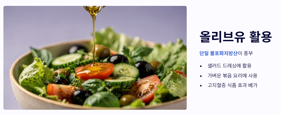- 올리브유 활용하기: 샐러드 드레싱이나 가벼운 볶음 요리에 올리브유를 사용하세요. 단일 불포화지방산이 풍부해 고지혈증에 좋은 음식의 효과를 배가시킵니다.