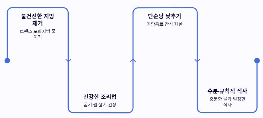 - 포화지방과 정제 탄수화물을 줄이고 불포화지방산 섭취를 늘려야 합니다.