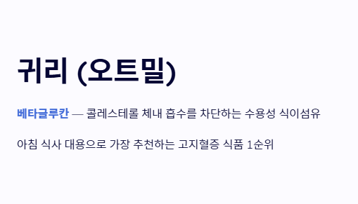 - 귀리(오트밀): 베타글루칸이라는 수용성 식이섬유가 풍부하여 콜레스테롤이 체내에 흡수되는 것을 막아줍니다. 아침 식사 대용으로 가장 추천하는 고지혈증에 좋은 음식입니다.