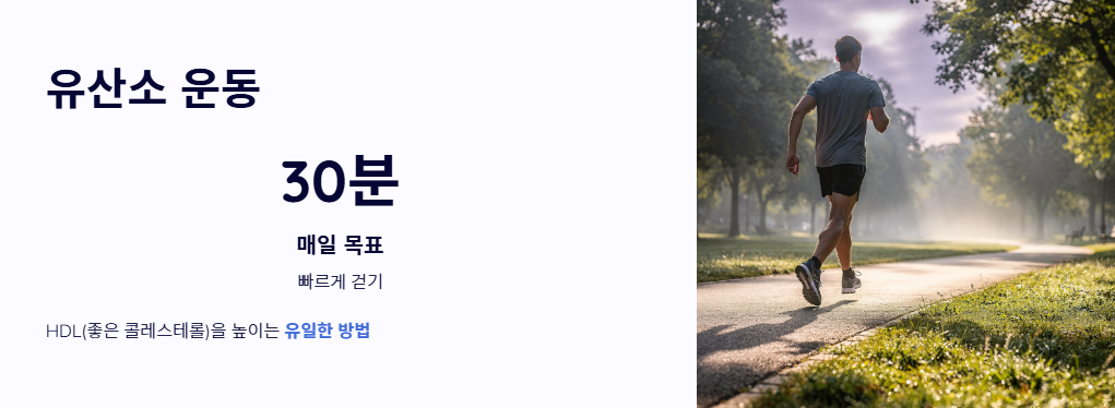 - 적당한 유산소 운동: 고지혈증에 좋은 음식으로 섭취한 영양소가 잘 대사되도록 매일 30분 이상 빠르게 걷기를 실천하세요. 운동은 좋은 콜레스테롤(HDL)을 높이는 유일한 방법입니다.