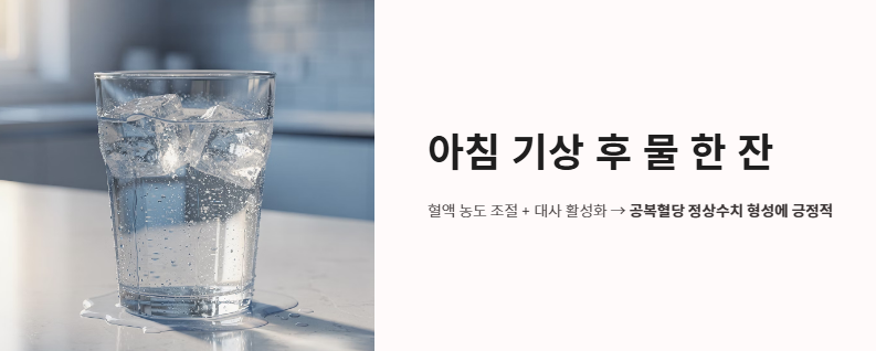 - 아침 기상 후 시원한 물 한 잔: 혈액 내 농도를 조절하고 대사를 활발하게 하여 공복혈당 정상수치 형성에 긍정적인 영향을 줍니다.