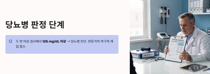 - 당뇨병 판정 단계: 두 번 이상의 검사에서 126mg/dL 이상이 나온다면 당뇨병으로 진단됩니다. 이 단계에서는 공복혈당 정상수치 회복을 위해 전문가의 적극적인 개입이 필수적입니다.