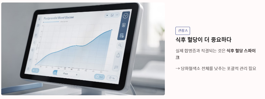 - 관점 A: '식후 혈당 수치'가 더 중요하다는 의견 공복 혈당은 간의 상태를 보여줄 뿐, 실제 합병증과 직결되는 것은 식후 혈당 스파이크라고 봅니다. 따라서 공복혈당 정상수치에만 매몰되기보다 전체적인 당화혈색소 수치를 낮추는 포괄적인 관리가 필요하다는 관점입니다.