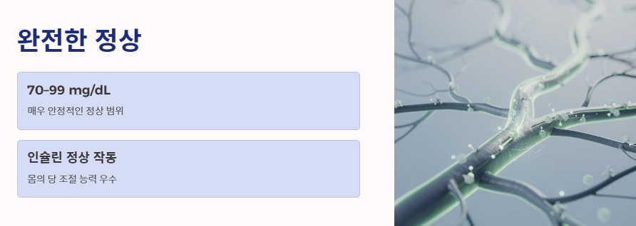 - 정상 범위는 70~99mg/dL이며, 100을 넘어서는 순간부터 주의가 필요합니다.