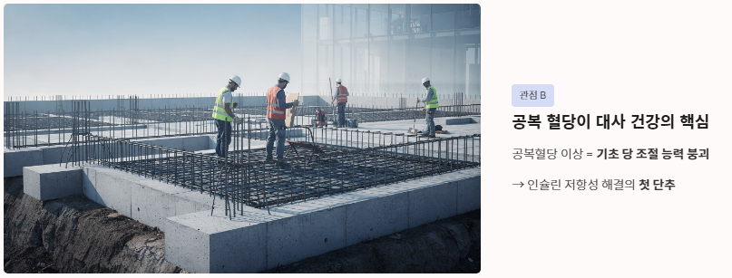 - 관점 B: '공복 혈당'이 대사 건강의 핵심이라는 의견 공복 혈당이 높다는 것은 이미 우리 몸의 기초적인 당 조절 능력이 무너졌음을 의미합니다. 공복혈당 정상수치를 회복하는 것이 인슐린 저항성을 해결하는 첫 단추이며, 이것이 해결되어야 모든 대사 질환을 근본적으로 막을 수 있다는 시각입니다.