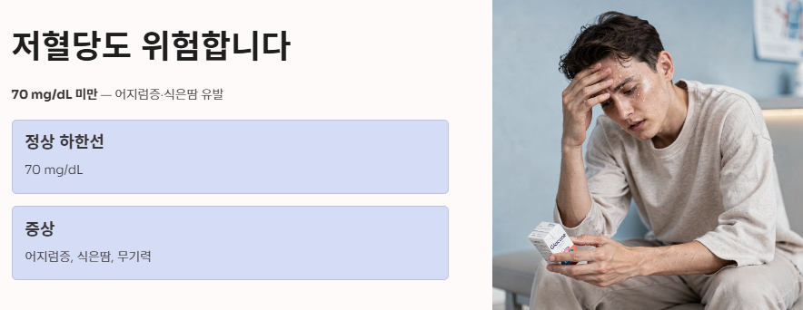 - 저혈당 주의: 70mg/dL 미만으로 떨어지는 것 또한 공복혈당 정상수치를 벗어난 것으로, 어지럼증이나 식은땀을 유발할 수 있어 주의가 필요합니다.
