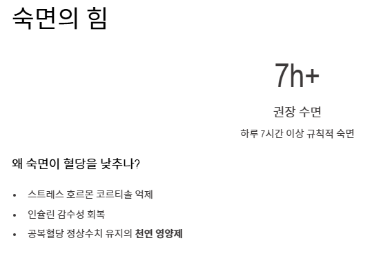- 전날 저녁 식사 관리와 충분한 숙면이 수치 조절에 결정적입니다.