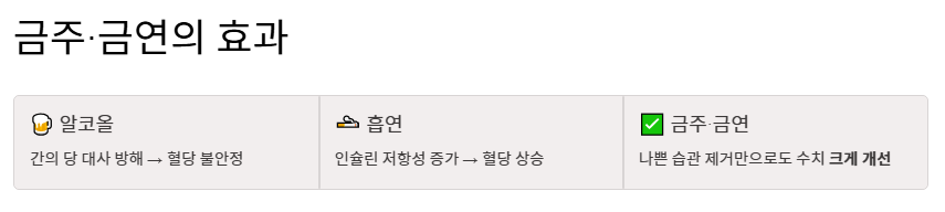 - 금주와 금연: 알코올은 간의 당 대사를 방해하고, 흡연은 인슐린 저항성을 높입니다. 나쁜 습관을 버리는 것만으로도 수치는 크게 개선됩니다.