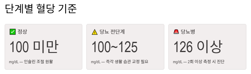 - 당뇨병 단계: 126mg/dL 이상이 두 번 이상 측정되면 당뇨병으로 진단합니다. 이때부터는 전문의의 진료와 함께 체계적인 관리가 시작되어야 합니다.
