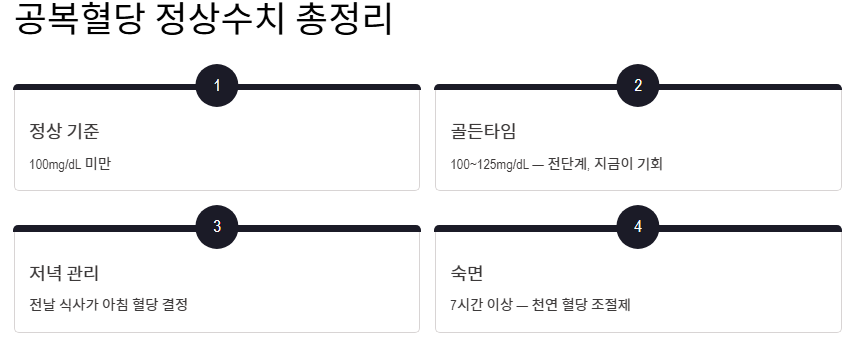 오늘 상세히 살펴본 공복혈당 정상수치에 대한 핵심 내용을 정리합니다.