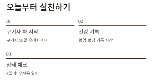 구기자 효능과 부작용을 정리하면, 눈 건강·피로 회복·혈당 조절이 주요 효능이고, 과다 섭취·약물 상호작용·체질 부조화가 주요 부작용입니다. 안전 섭취량 10~15g을 4주 단위로 주기하며, 위험 신호 시 즉시 중단하는 것이 구기자 효능과 부작용 관리의 핵심입니다.
