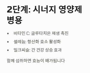 비타민 C, 셀레늄, 밀크씨슬 등은 체내에서 글루타치온이 재생되고 생성되는 것을 돕습니다. 이들을 함께 섭취하면 글루타치온 효능이 배가됩니다.