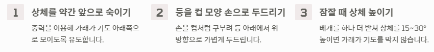 가래가 걸려 나오지 않을 때는 상체를 약간 숙이고 등을 가볍게 두드려주는 것이 효과적인 기침 가래 멈추는 방법입니다. 또한, 잠을 잘 때 상체를 약간 높게 하면 가래가 기도를 막는 것을 방지하는 기침 가래 멈추는 방법이 됩니다.
