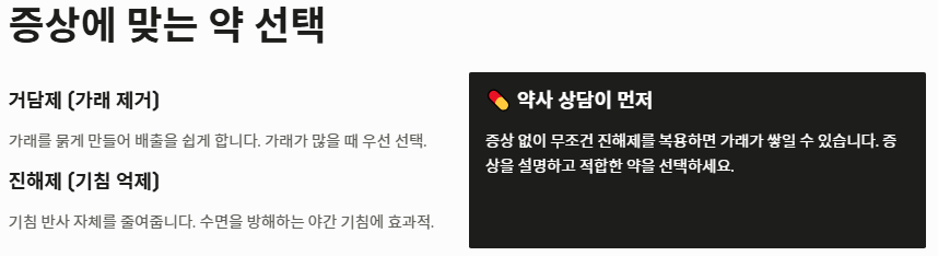 증상이 심할 때는 무조건 참기보다 거담제나 진해제를 복용하는 것이 의학적인 기침 가래 멈추는 방법입니다. 약사와 상의하여 자신의 증상에 맞는 기침 가래 멈추는 방법을 선택하세요.