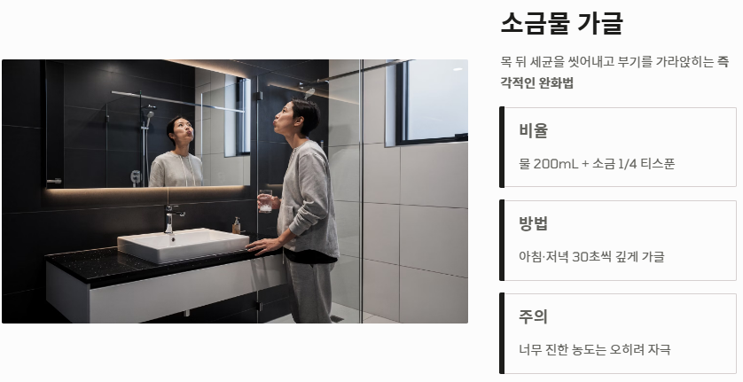 목 뒤쪽의 세균을 씻어내고 부기를 빼주는 소금물 가글은 즉각적인 기침 가래 멈추는 방법으로 추천됩니다. 농도가 너무 진하지 않은 소금물로 아침저녁 가글을 실천해 보세요.