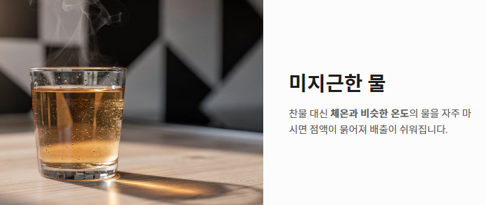 - 미지근한 물 자주 마시기: 찬물보다는 체온과 비슷한 미지근한 물을 마시는 것이 점액을 묽게 만들어 주는 최고의 기침 가래 멈추는 방법입니다.