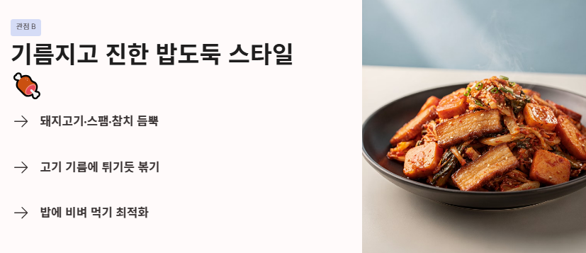 - 관점 B: '기름지고 진한' 밥도둑 스타일 돼지고기나 스팸, 참치를 듬뿍 넣어 기름진 감칠맛을 극대화합니다. 고기 기름에 김치를 튀기듯 볶아 묵직한 맛을 내는 방식으로, 밥에 비벼 먹기에 최적화된 김치볶음 맛있게 하는법을 지향하는 관점입니다.